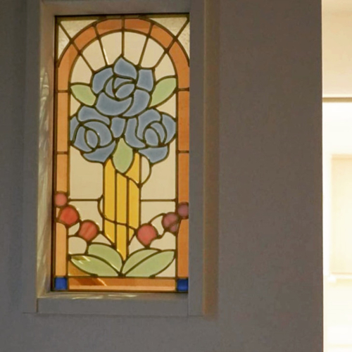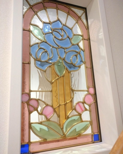玄関との間仕切りとして、SH-A20(青いバラ)とスズランのモチーフを組み合わせた、特注ステンドグラスを制作しました。