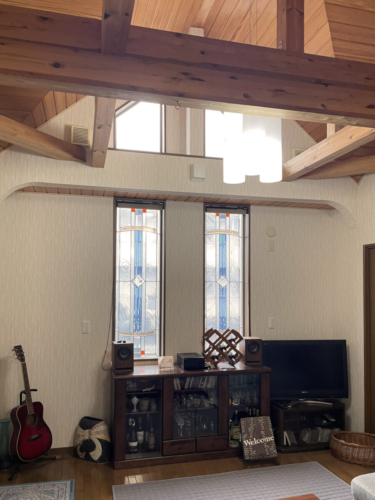 吹き抜けLDKを彩るシンプルデザインのステンドグラス