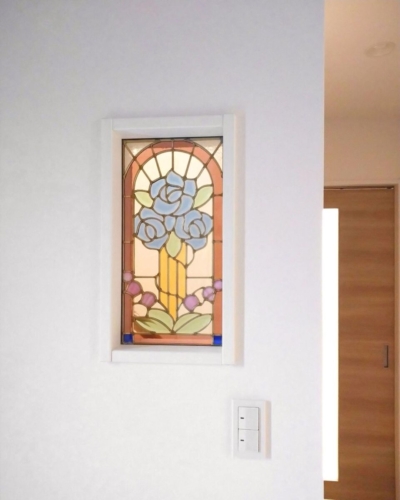青いバラとスズランのモチーフ特注ステンドグラス間仕切り壁